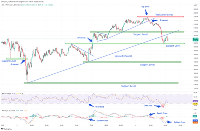 On February 4, 2025, Solana (SOL) displayed a volatile price action, initially forming an upward channel before facing rejection at $222. A breakout at the $202.50 level at 15:15 initiated a strong bullish run, with SOL reaching the day’s peak at $222. However, a death cross on the MACD signaled a downturn, leading to a retracement. SOL found support at $202.50 before rebounding, confirmed by a golden cross at 06:00 UTC. At the same time, the RSI also indicated oversold conditions, which strengthened the recovery. SOL’s final price hovered around $205.40, suggesting potential for further movement.