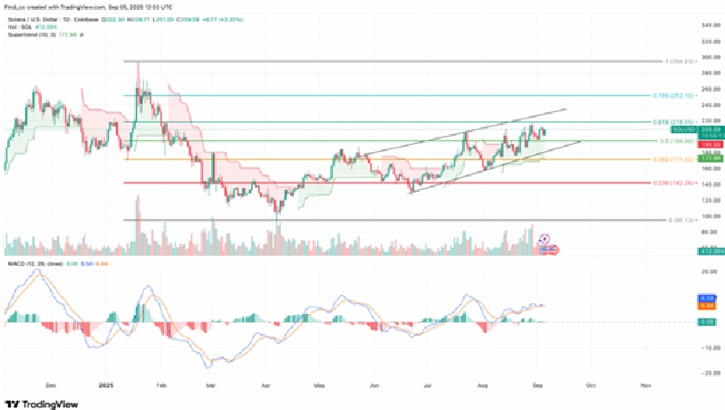 Solana has been one of the most consistent performers in the market this year. According to CoinMarketCap, SOL is priced around $203 with daily highs just above $203.9. Technical patterns suggest that the trend remains intact. Chart watchers point to an ascending channel that has held strong for weeks. The Supertrend indicator remains green under price action, while the MACD momentum indicator continues to favor buyers. SOL is also trading well above both its simple moving averages. In simple terms, the uptrend remains alive, and buyers are in control. This technical strength is backed by real activity on the chain. In August alone, Solana processed about 2.9 billion transactions, with active addresses doubling to 83 million. Whale wallets have quietly added more than 2.5 million SOL, showing confidence among bigger players. Cointelegraph also reported that open interest in Solana derivatives has reached an all-time high of over $13 billion, which could fuel even sharper price movements. If resistance around $210 to $220 breaks, a clean move toward $250 looks possible within weeks. Some traders are even targeting higher zones if market sentiment continues to rotate into altcoins.