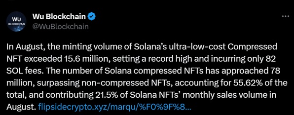 In August, Solana’s NFT — specifically its ultra-low-cost Compressed NFT — shattered previous records, achieving a new minting volume of 15.6 million. This extraordinary feat caught the attention of the prominent Chinese reporter, Colin Wu who promptly shared this groundbreaking news on Twitter.