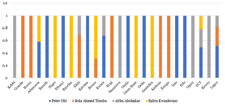 Our analyst discovers some states where no searches were made within campaigns and elections format about the candidates between September 28 and December 21, 2022, similar to the undecided and those who refused to mention candidate they would vote for during the election in Anap Foundation & NOI Polls’ survey. Abia, Akwa Ibom, Cross River, Jigawa, Kano, Oyo, Plateau, Sokoto, Taraba, Yobe, and Zamfara are the states (see Exhibit 4).
