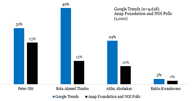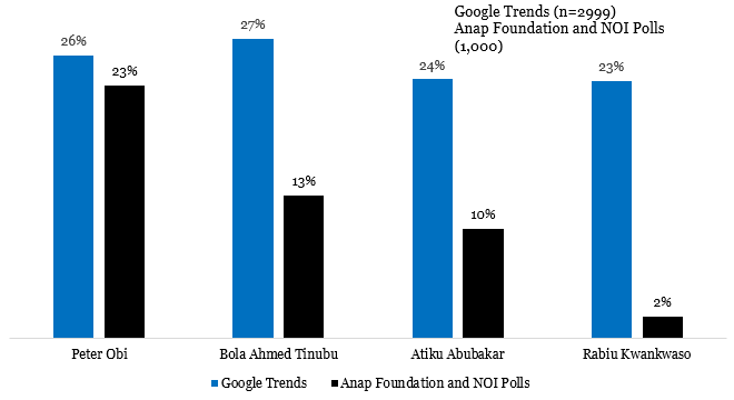One of the most compelling reasons for using “big data polls” is the ongoing debate about how technology has reshaped how information flows during the Nigerian election cycle. In other words, through the use of the Internet, people can gain access to a variety of information about how parties, candidates, and other stakeholders are performing, allowing them to make better decisions or choices. Considering this position, as well as the NOI Polls’ observation that a high percentage of participants were of youth age, our analyst concludes that those participants sought information about the candidates and their programmes. As a result, public searches as “big data polls” cannot be ruled out in predicting public voting behaviour ahead of the election.