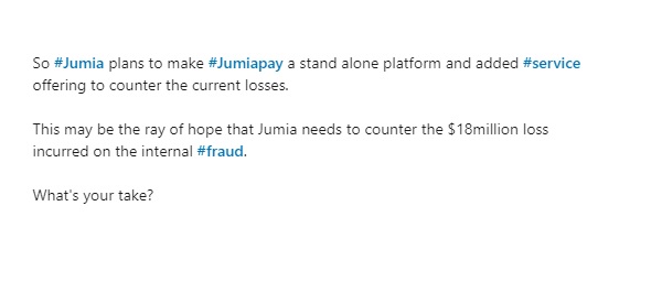 I am not sure Jumia has a lot of “trusts” in the financial “trustbank” to play that game. I do not believe that it was fraud that the management did not know. Nigeria is a very small economy for $18m to be under the table without top management knowledge. But if people do still believe Jumia, the spinoff will unlock more value for shareholders. JumiaPay with about 5 million “users” [the estimated Jumia users] will be one of the largest non-bank fintech players in Africa. Largely, JumiaPay can get at least $200m valuation there. Currently, the fintech unit is largely discounted by markets in the NYSE – few care about that JumiaPay component, mainly focusing on the ecommerce GMV, PL, etc.
