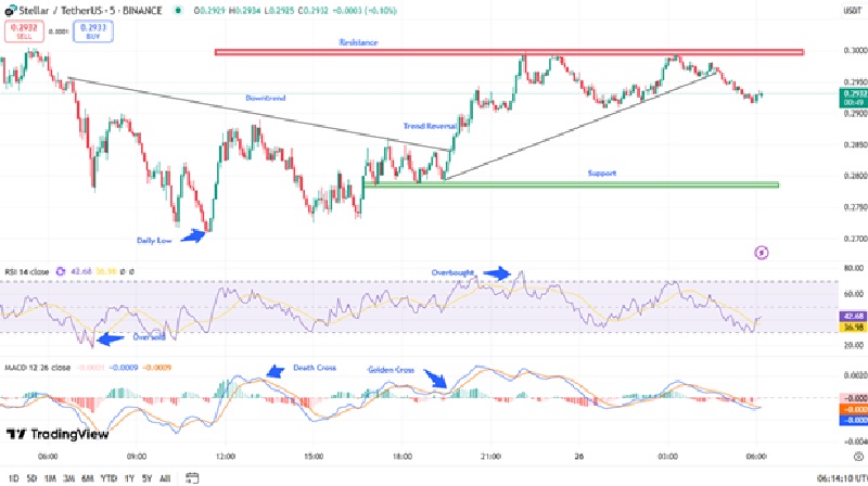 Yesterday, XLM dropped to a daily low of $0.28 before rebounding. The RSI reached oversold levels, triggering buying momentum that led to a golden cross on the MACD, confirming bullish strength. The price rallied to $0.30, where sellers took control. A death cross later signaled weakness, causing a pullback to $0.293, which continues today.