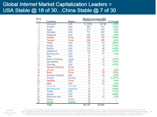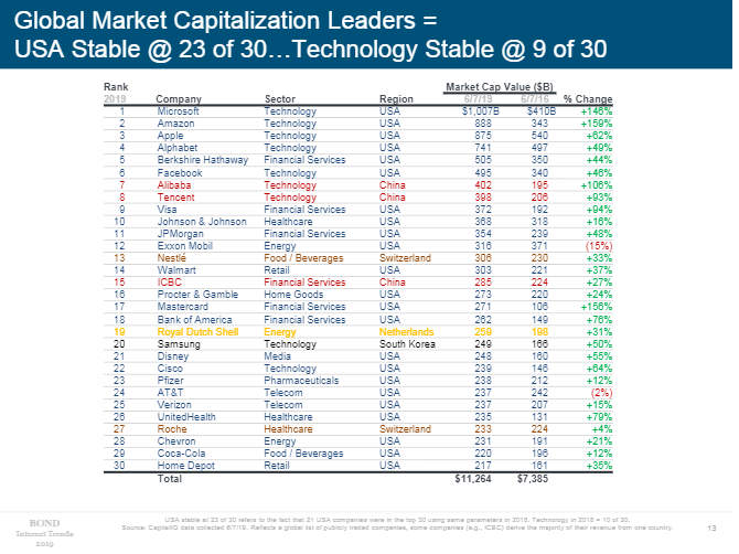 - 7 of the 10 most valuable companies in the world are tech firms. The non-techs are bolded.