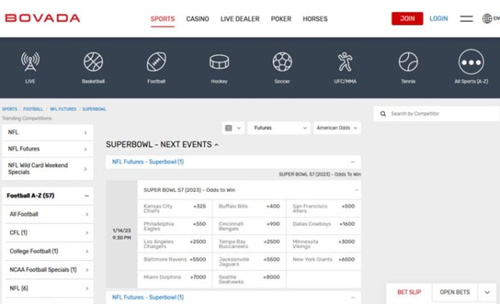 As a football fan, you will be pleased to know that there are plenty of features available at Bovada, including NFL specials, college football, Bitcoin promos, betting guides, line selectors, sportsbook calendars, and market searches.