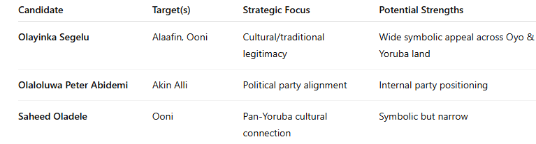 Olayinka Segelu emerges as the most strategically embedded candidate in the symbolic network, having extended public felicitations to both the Alaafin of Oyo and the Ooni of Ife. These aren’t mere ceremonial gestures, calculated acts of political signaling.