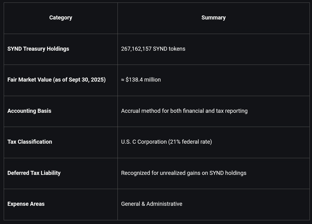 As of September 30, 2025, the DUNA held 267,162,157 SYND tokens and $285,000 cash on hand.