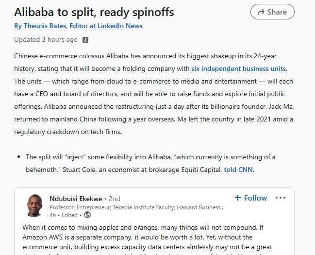 Our piece on Alibaba was selected by LinkedIn Editors and featured on the mainboard. The piece is here