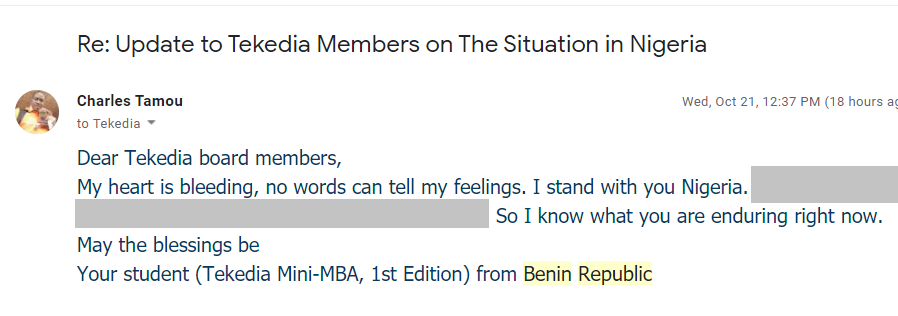 To our Nigerian members, I want to let you know that our Tekedia Community has been sending words of strength and encouragement from around the world. From Canada to Singapore to Benin Republic, the message is clear: peace and blessing.