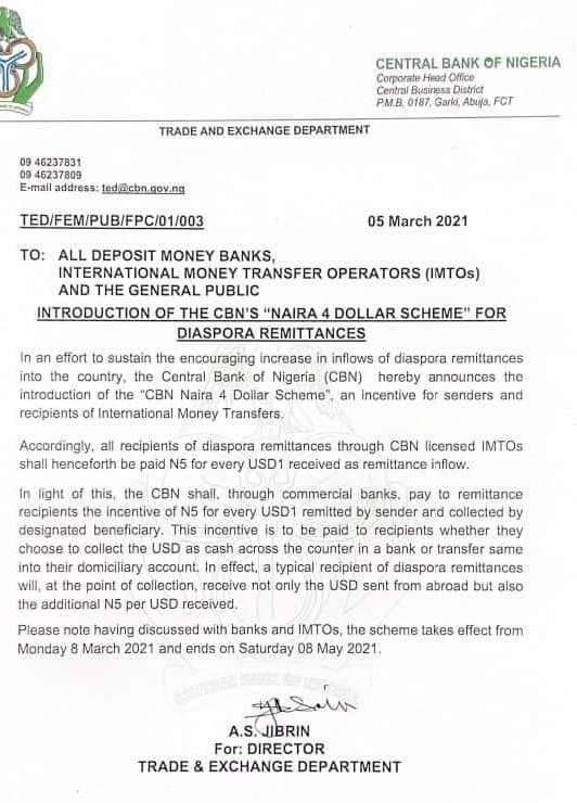 In an effort to sustain the encouraging increase in inflows of diaspora remittances into the country, the Central Bank of Nigeria (CBN) hereby announces the introduction of the “CBN Naira 4 Dollar Scheme”, an incentive for senders and recipients of international Money Transfers.
