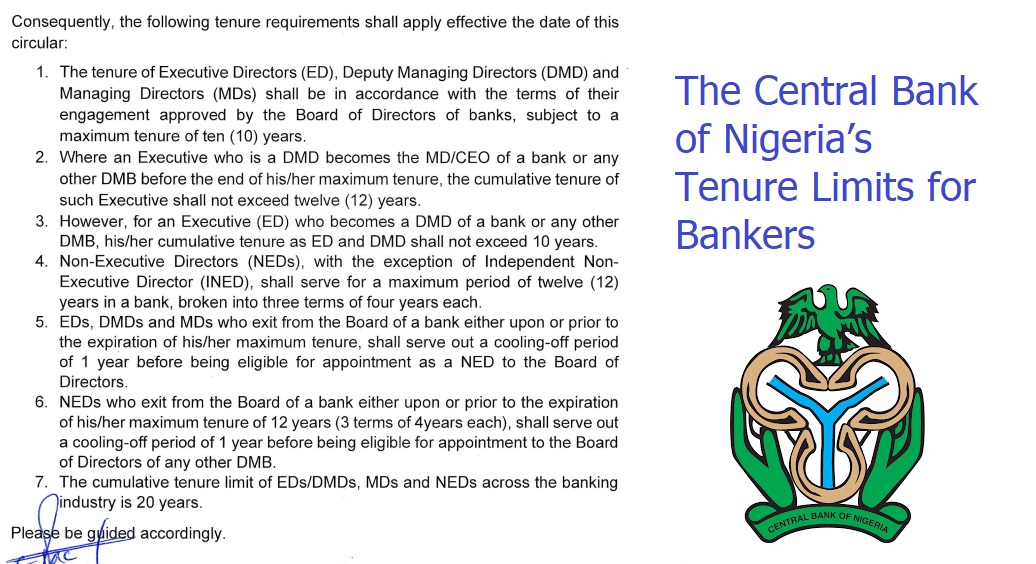 Simply, Nigerian bank executives can only serve a cumulative tenure of 20 years across the banking industry: “The tenure of executive directors (ED), deputy managing directors (DMD) and managing directors (MDs) shall be in accordance with the terms of their engagement approved by the board of directors of banks, subject to a maximum tenure of ten (10) years.”