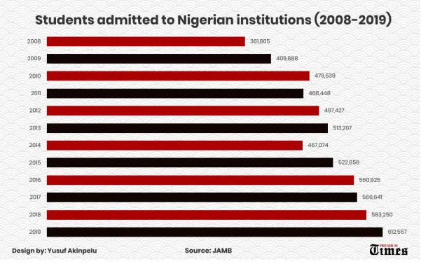 Across all the educational institutions in Nigeria, two-thirds of about two million Nigerian candidates who applied for tertiary education in 2019 were not admitted, according to the JAMB.