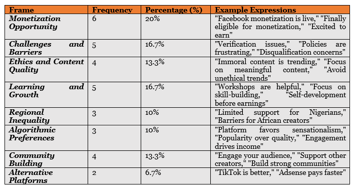 The most dominant frame, monetization opportunity (20%), reflects the optimism of creators eager to capitalize on Facebook’s monetization features. Phrases like “Finally eligible for monetization” and “Excited to earn” underscore the aspirations of individuals who see content creation as a path to financial independence. For many creators, Facebook offers a platform to transform their passion into a sustainable career, with tools such as ad revenue sharing, subscription models, and fan support. This framing aligns with global trends in the creator economy, where platforms like YouTube, TikTok, and Facebook compete to attract and retain content creators by offering financial incentives. However, the accessibility and long-term viability of these opportunities remain critical areas of concern.