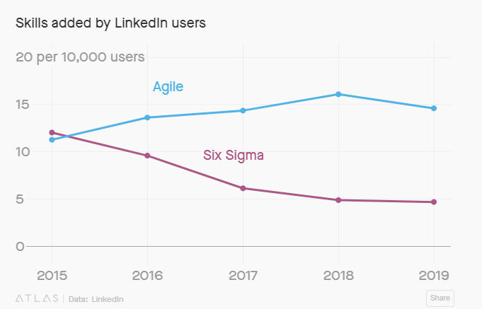Even GE, the home of six sigma, is seeing lesser value using it: “The company’s [GE] market cap, which reached a high of nearly $600 billion in mid-2000, sank to around $60 billion late last year.” With the fading of GE, so is the spark in six sigma. That does not mean that the problem is with six sigma. What has happened is that people do not want to think into the pursuit of perfection philosophy that supports six sigma; if you want to be wholly perfect before you can launch a digital product, you will never launch. Yes, the speedy shall inherit the world.