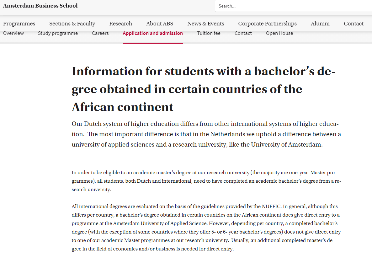 The School of Business in Amsterdam University, Netherlands, has come under criticism for “devaluing” bachelor degrees from Africa, apart from South Africa and Ghana.