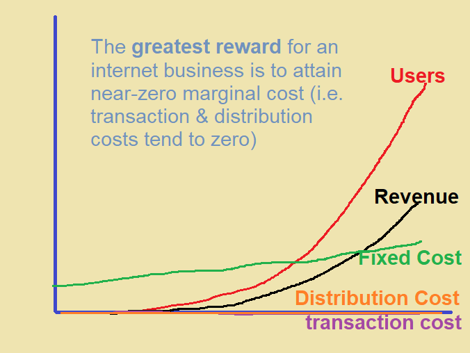 In a perfect internet market, the marginal cost of a digital product is zero. But no market is perfect, so, what we have in reality is that the marginal cost tends towards near-zero. What that means is that the transaction and distribution costs stay low even as output increases. Whenever you attain that positioning, your unit economics improves since you are essentially having accelerating returns which keep compounding.