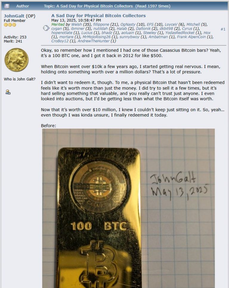 Here we see the journey of indecision between 2012, when John Galt bought a 100BTC Casasius Coin for $500 USD and May 2025, when he sold it for $10 Million.