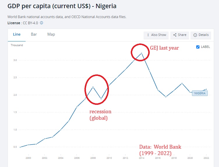 Good People, check the plot of Nigeria per capita income since 1999; they stopped the trajectory when they came in. For years, even in the depth of the Great Recession of 2007/ 2008, Nigeria was growing the GNI per capita. But somehow, a team came and the slope froze. This is not to say that PDP was better, but if you look at comparative time periods, PDP has outperformed in all categories.