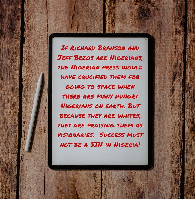 If Richard Branson and Jeff Bezos are Nigerians, the Nigerian press would have crucified them for going to space when there are many hungry Nigerians on earth. But because they are whites, they are praising them as visionaries. They will attack Dangote even when they praise American cities for giving Amazon HQ2 tax breaks. To thrive in Nigeria, filter the noise and stay focused. Obi Cubana shaped all; the nation did not even notice that bandits killed 13 policemen in Zamfara on Sunday. Success must not be a SIN in Nigeria!