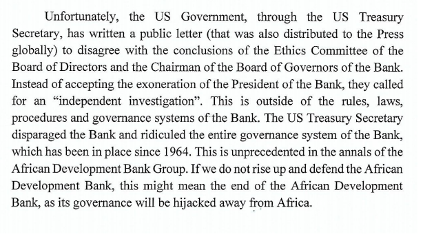 I have the letter written by Nigeria’s former President (Olusegun Obasanjo) to former presidents of African countries after the U.S. Treasury Secretary wrote, rejecting the conclusion of the African Development Bank (AfDB) Ethics Committee, and requesting a new investigation, on the allegations against the bank’s President.The key line: “It is also critical that we emphasize the need for the AfDB to remain an Africa-focused development Bank rather than one which serves interests outside Africa”. I will not share the full letter as it contains many personal details.