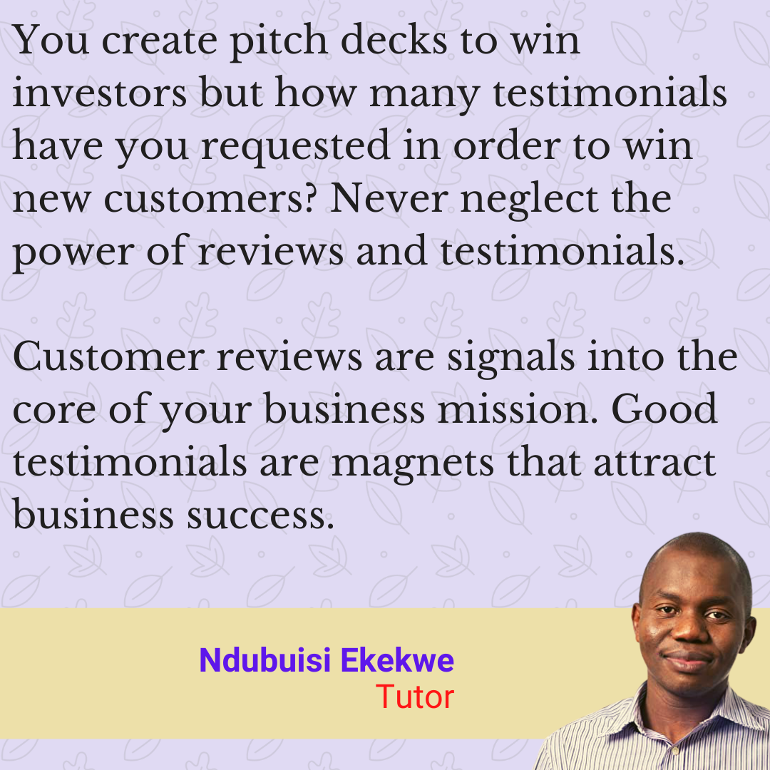 At Tekedia Institute, we have noticed one thing from analytics: most visitors who visited our testimonial page ended up registering for our services. Add a testimonial page on your website!