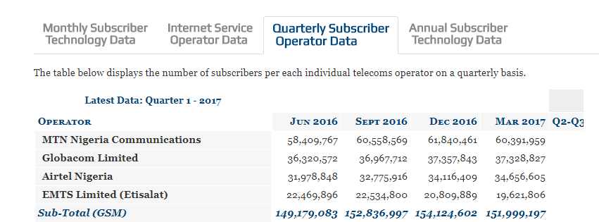 Please refer to NCC (Nigerian Communications Commission) data here which is reproduced in the table below.