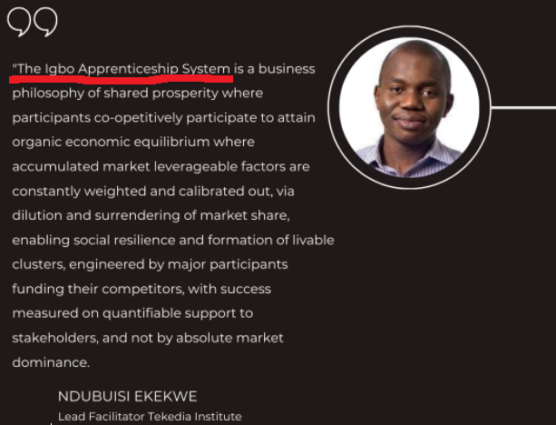 The Igbo Apprenticeship System is a business philosophy of shared prosperity where participants co-opetitively participate to attain organic economic equilibrium where accumulated market leverageable factors are constantly weighted and calibrated out, via dilution and surrendering of market share, enabling social resilience and formation of livable clusters, engineered by major participants funding their competitors, with success measured on quantifiable support to stakeholders, and not by absolute market dominance.