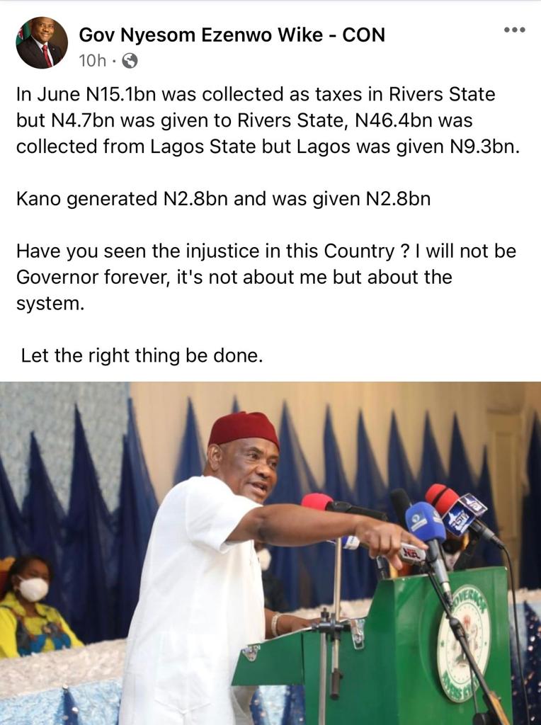Read this Facebook post by Rivers State governor, Governor Wike, as the battle for who collects VAT in Rivers state rages.