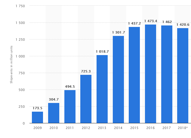 Much has been written about poor Q4 2018 quarterly records from Apple and Samsung on smartphone shipments. The immediate future may not be different for the sector – a piece from Nikkei seems like even upcoming quarters may not offer new trajectories. Largely, it does seem like smartphone market is maturing, similar to what happened in the PC and laptop markets many years ago. A shown in the plot below, the peak might have been attained already, so it can only go lower.