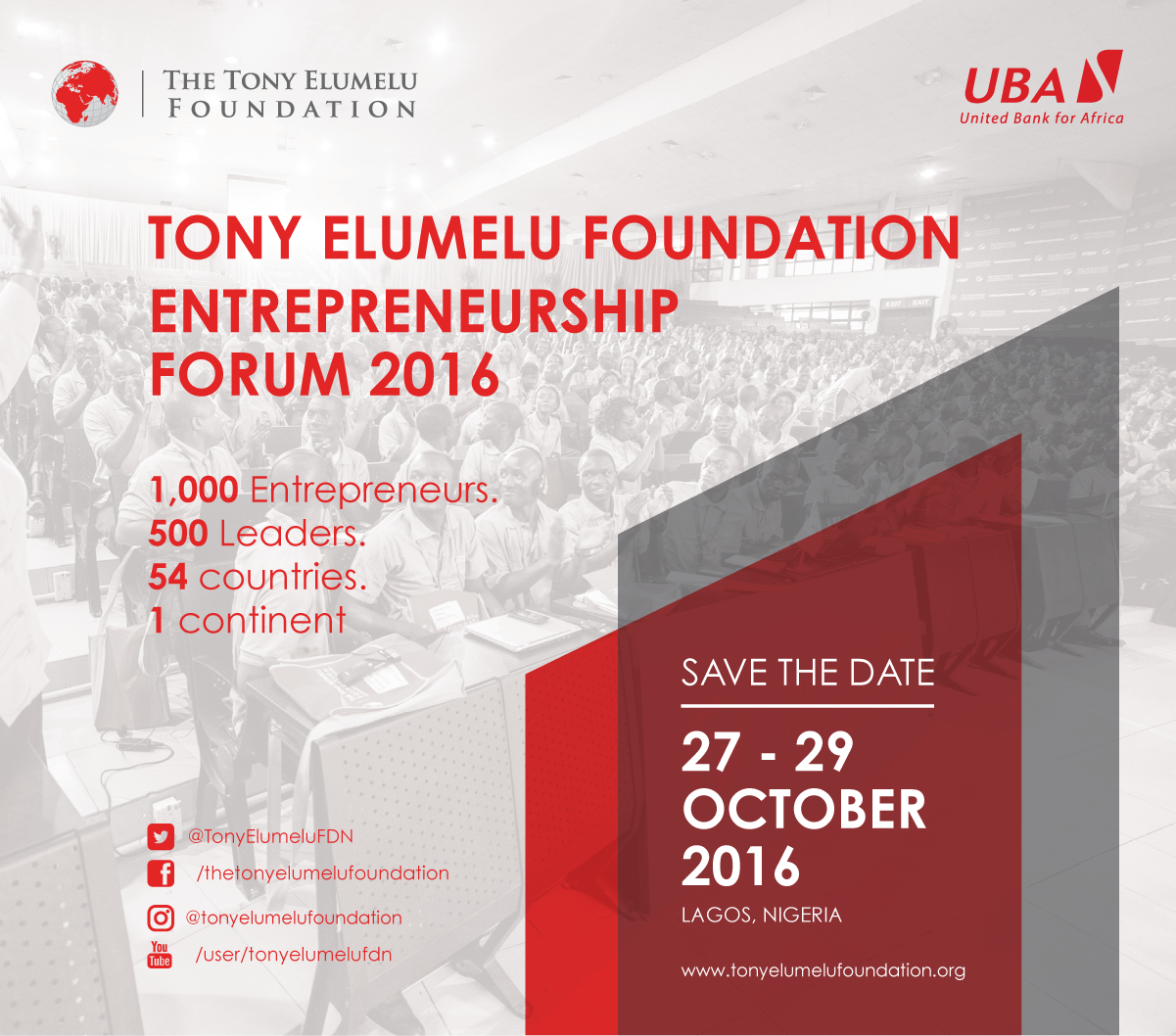We are pleased to inform you that the Tony Elumelu Foundation Entrepreneurship Forum 2016, will hold in Lagos, Nigeria from Thursday 27- Saturday 29, October 2016.