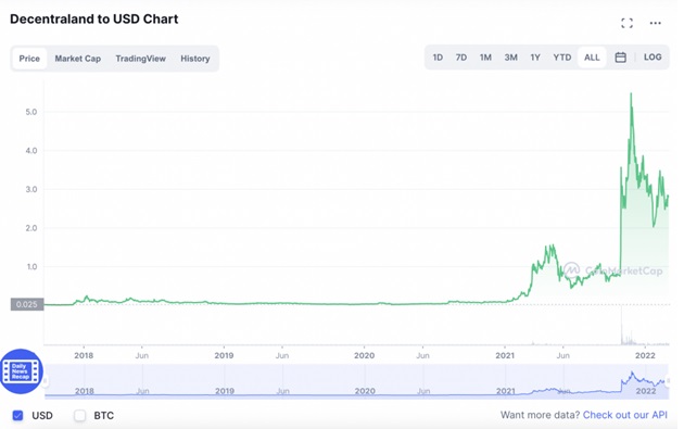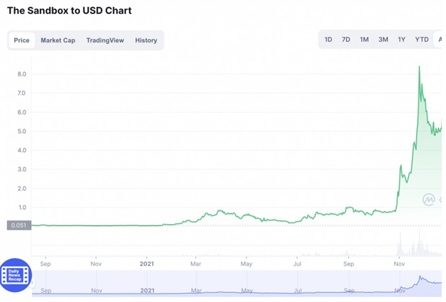 Users can also buy and sell in-game items to enhance the Decentraland experience. In terms of market performance, Decentraland was priced at just $0.025 when it first hit public exchanges in 2018. Fast forward to November 2021 and the same Metaverse crypto coin hit all-time highs of $5.90.