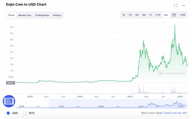 And, in late 2021, Enjin announced that it would be raising $100 million to fund its Metaverse journey. On the one hand, this up-and-coming Metaverse token has enjoyed a major upward pricing trend since being listed on public exchanges in 2017. For instance, early investors would have paid just $0.017 per token.