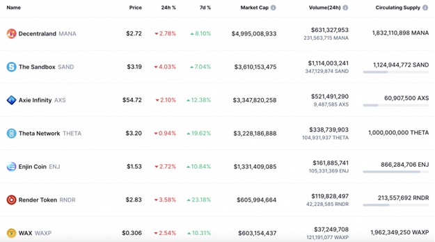 According to CoinMarketCap, there are currently just under 200 Metaverse crypto coins that you can buy. Of this Metaverse crypto coins list, less than 10 projects have a market capitalization of over $500 million.