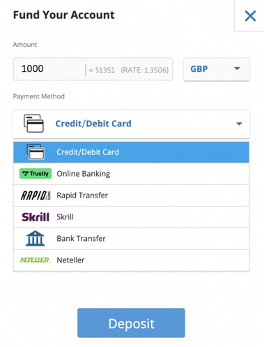 The fastest way to deposit funds is via debit or credit card, as this is processed instantly. Otherwise, elect to fund your account via a domestic bank wire, ACH, or an e-wallet.