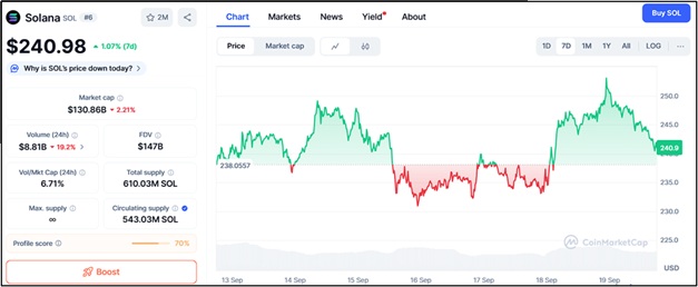 Another altcoin that remains firmly on buyers’ watchlists is Solana (SOL). Known for its speed and low fees, Solana has carved out a main function as a high-performance Layer-1 blockchain. Trading near $240, Solana has rallied strongly in 2024 and is entering 2025 with bullish momentum.