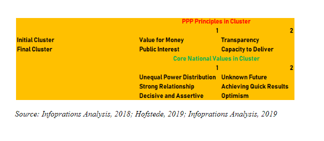 The ranking of the country’s quality of air transport infrastructure resonated with the values by 68.8%. Quality of roads and local supplier quantity also connected with the values positively. However, it would be difficult for the companies and government to maintain existing infrastructure and future ones without addressing the emerging issues along with some negative national values. For instance, the unequal power distribution value which emphasises the need for the subordinates to respect their seniors and that ideal leader or boss is a benevolent autocrat would impact the negotiation and eventual implementation of any PPP contract.