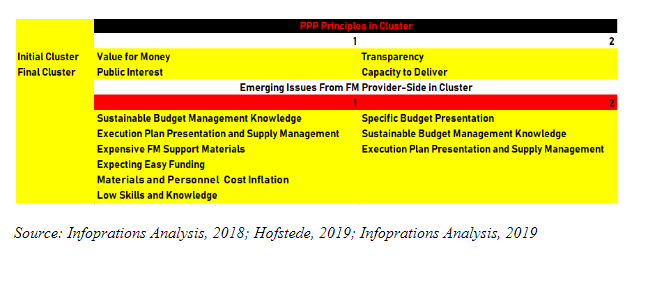 In this regard, FM companies should foster strong relationship and provide documents capable of establishing their competencies and availability of the right resources to deliver the promised value. When the emerging issues from the FM provider-side are not addressed before initiating PPP, analysis suggests that government is likely to doubt the transparency status and capacity to deliver the promised value.