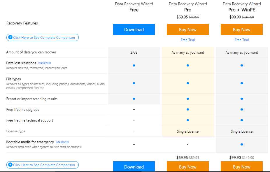 EaseUS Recovery Wizard has three main editions and they have different recovery features as noted in the table below.