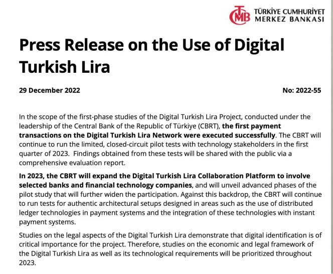 The Central Bank of the Republic of Turkey (CBRT) has completed the first trial of its central bank digital currency (CBDC), the Digital Turkish Lira, and has signaled plans to continue testing throughout 2023.