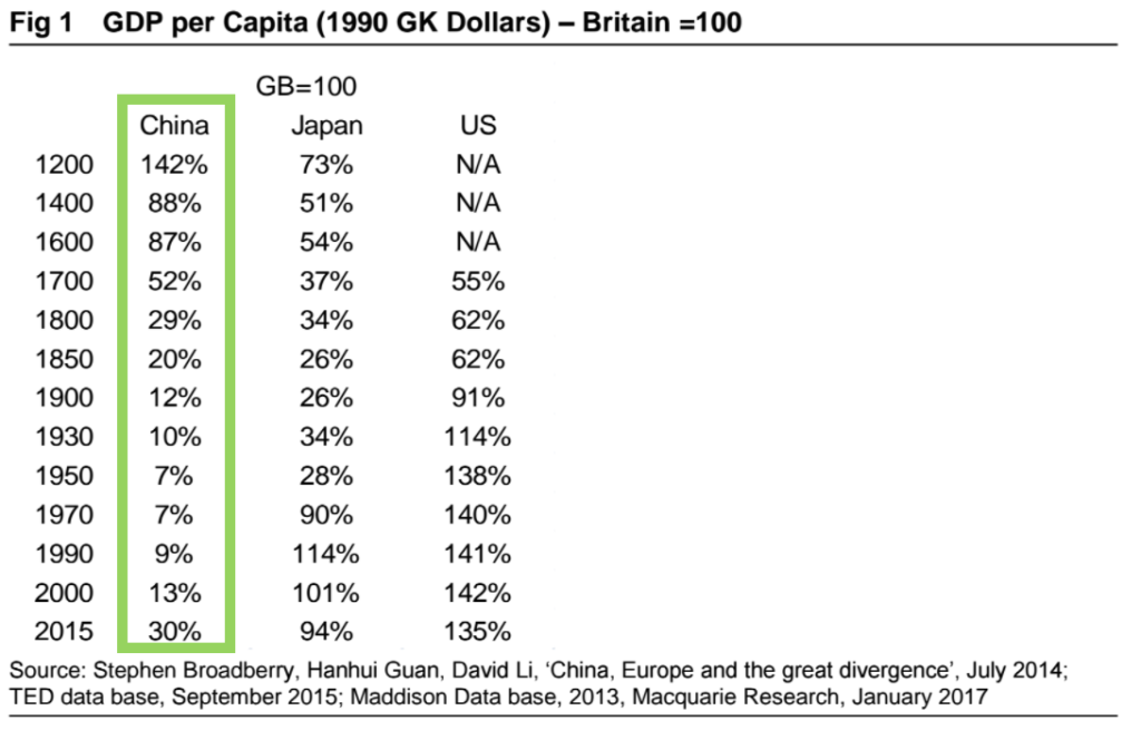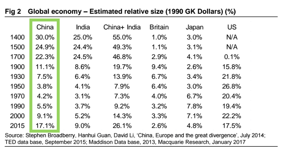 In the 15th and 16th centuries, China was about 25-30% of the global economy, but come 1950-1970, after the destruction of World War II and under the rule of Mao Zedong, it was under 5%. Today, its economy is about 17% of the global economy — roughly the same as the US.