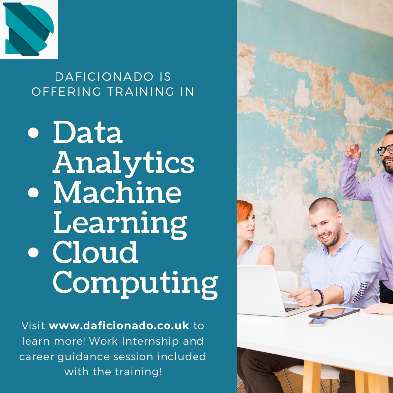 Daficionado is a Data Analytics, AI and Cloud Computing training company. You can also chat with them on WhatsApp (+234 818 601 9414). Take advantage of any internship opportunity for practical experiences.
