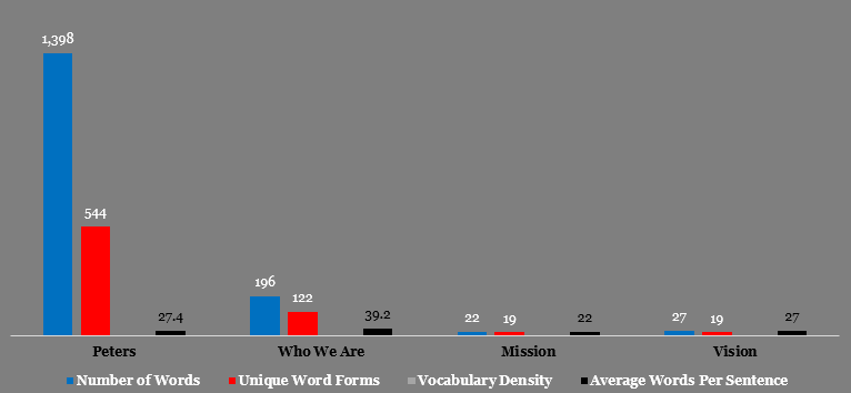 Meanwhile, it appears that what publics cannot get from the company’s strategic statements absolutely has been catered for by the responses of Ukeme Peters. In his responses to the questions asked by our analyst, Ukeme Peters employed 1,398 words. A total of 544 unique words was found. On like the mission and vision statements that have higher percent for vocabulary density, 38.9% achieved by Ukeme Peters indicates that his responses are most likely to be understood easily by the readers.