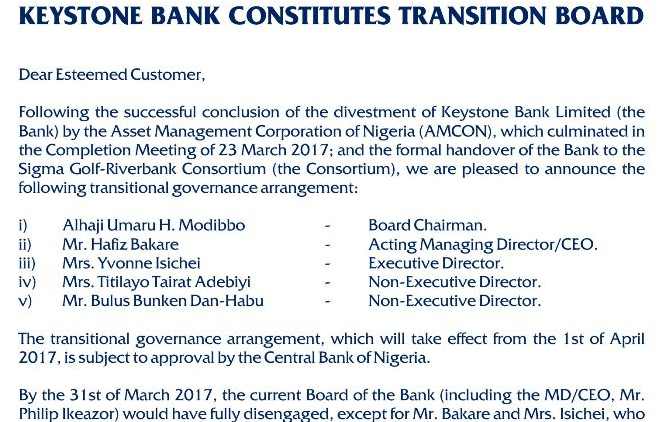 According to the statement: “The transitional governance arrangement, which will take effect from the 1st of April 2017 is subject to approval by the Central Bank of Nigeria.