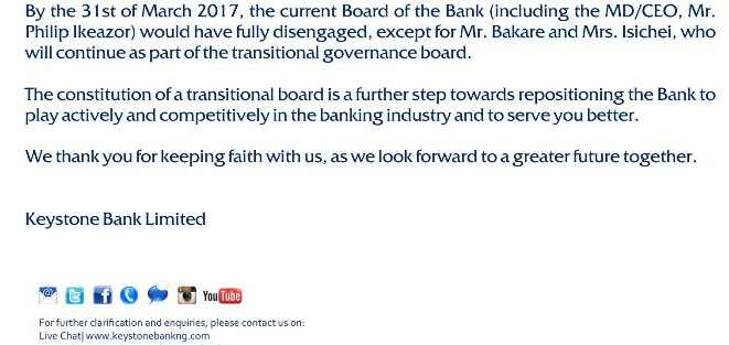“By the 31st of March 2017, the current board of the bank (including the MD/CEO, Mr. Philip Ikeazor) would have fully disengaged, except for Mr. Bakare and Mrs. Isichei, who will continue as part of the transitional governance board.”