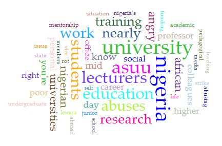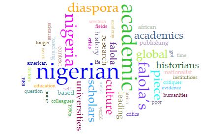 Our analysis covers the response of Professor Moses Ochonu [Professor of African History at Vanderbilt University in Nashville, Tennessee, USA] based on Professor Toyin Falola’s piece. Professor Ochonu focused on academic, diaspora, Professor Falola, Nigeria and Nigerian. Following Professor Ochonu’s path, Mohammed Dahiru Aminu, assistant Professor of Petroleum Chemistry at the American University of Nigeria, Yola, titled his piece Of Toyin Falola, African Scholars and the Western Academy. He focused on quality of doctorate, research, universities. Bode Ojoniyi, who lives in Osogbo, the Osun State Capital, is another person who replies Professor Falola with the title When the Nigerian Diaspora Academics Write Back to the ‘Locals’…He focused on academic, academics, diaspora, gods [referring to some individuals and authorities making knowledge production difficulty in Nigeria] and Nigeria.