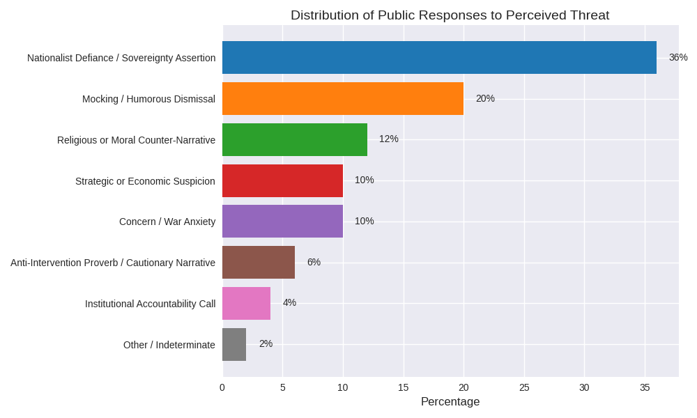 Across all categories, the reactions highlighted the complexity of Nigerian public opinion when confronted with foreign threat narratives. The dominant pattern was not simple acceptance or rejection but a negotiation of meaning rooted in nationalism, lived insecurity, humor as coping strategy and distrust of global power intentions.
