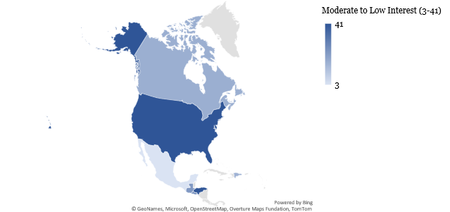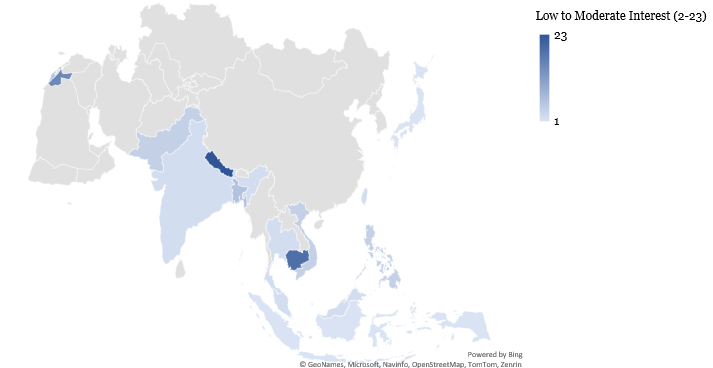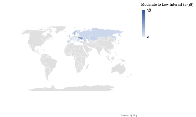In Eastern Europe, Georgia (38), Bosnia & Herzegovina (31), Moldova (27), and Ukraine (19) recorded relatively high interest, underscoring the role of USAID in promoting economic stability, democratic governance, and post-conflict recovery in these regions. These nations have historically relied on U.S. aid as a counterbalance to Russian influence, raising questions about how they will navigate the void left by USAID.
