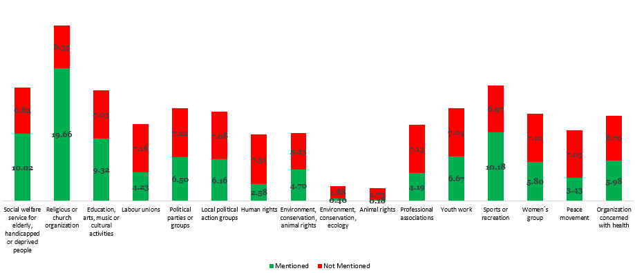 Among the surveyed groups, social welfare services for the elderly, handicapped, or deprived people saw strong participation, with 10.02% of respondents mentioning engagement. Similarly, religious or church organizations attracted the highest engagement at 19.66%. This highlights the enduring role of faith-based and humanitarian groups in fostering community support.