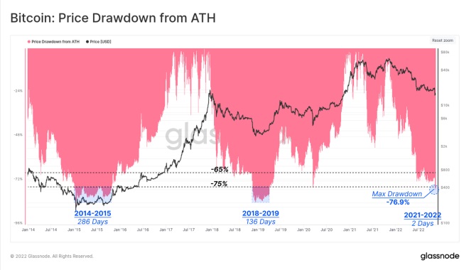 This week, the spot price of Bitcoin dropped to a multi-year low of $15,801 amidst the FTX collapse, with BTC now -76.9% below the cycle top set in November 2021. Previous generational lows have recorded >75% market devaluations from the peak, bringing this bear market in line with prior cycle drawdowns. BTC drawdowns greater than 75% have persisted for several months in previous cycles, suggesting duration may still be ahead if history rhymes.