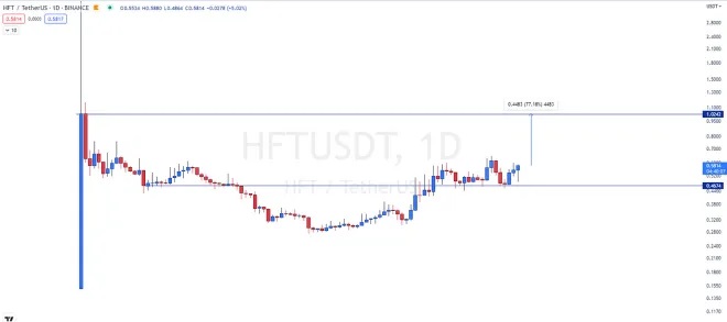 Although, Cantering Clark initially shared a tickerless chart, he eventually unveiled the name of the low-cap altcoin on his radar. “This is not a microcap but smaller never the less so be mindful, but HFT looks like it is going to push much higher before what is probably a long corrective re-accumulation period. I am long.”